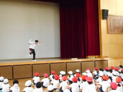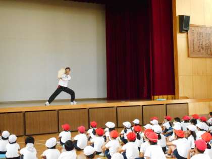 3年生は、東北は山形に伝わる民謡花笠音頭を踊ります。先生方はお休み中に一生懸命練習していました。かっこいい模範演技に、子供たちは「かっこいい〜」「先生じょうず」「難しそう」と言っていました。これからが楽しみです。他の学年の様子も今後お知らせします。