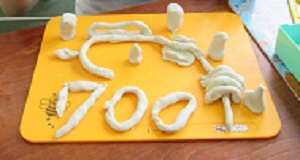 5月10日(水)。図画工作の「ひもひも ねんど」の学習をしました。はじめは、粘土を柔らかくするために、コネコネして元気玉を作りました。次に、ロールケーキに形にし、最後に紐状にして、作品を作りました。おやおや、これは誰の作品かな?