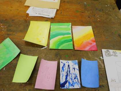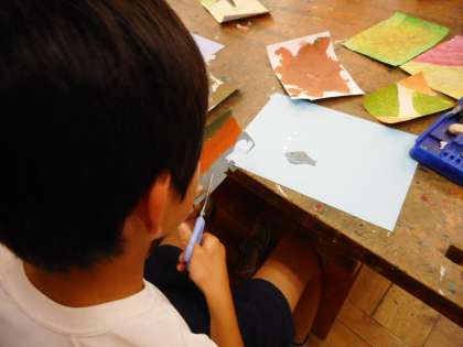 各自が作った色紙の特徴を考え、自分が表したいものを、切ったりはったりして、楽しそうに表現していました。
