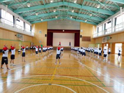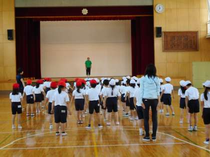 体育館からはラジオ体操第一の音楽が聞こえてきました。見に行くと、1年生がじょうずに音楽に合わせて体操をしていました。忍者のポーズもかっこよくなりました。