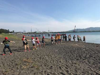 めったにできない体験、地引き網。みんなの力を合わせて、どっこいしょー、どっこいしょー!