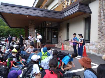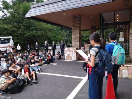 宿泊するホテルに到着しました。玄関前で開校式を行いました。今日から三日間お世話になります。よろしくお願いします。