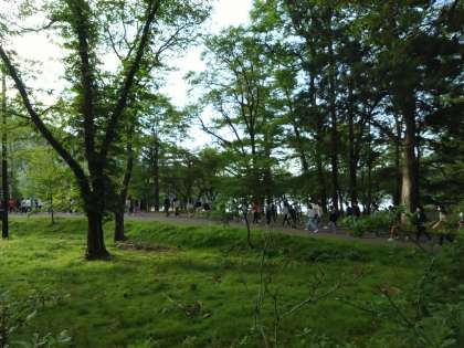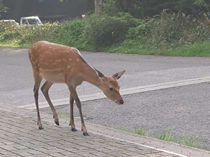 気持ちのいい朝です。湯の湖畔まで歩きます。途中でシカに遭遇。