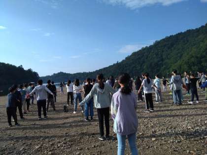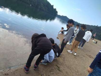 湯の湖畔で体操をしたあと、朝の会をしました。気持ちの良い空気をたくさん吸い込んで、日光の自然を満喫しました。