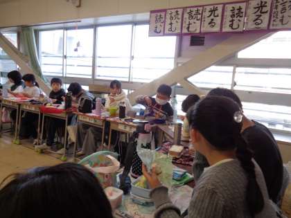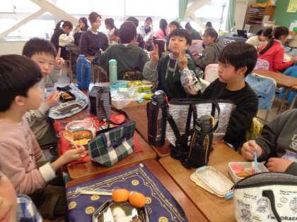 5年生は今日、校外学習に出かける予定でしたが、先日の雪の影響もあり来週に延期となりました。給食を止めていたので、お弁当をもってきてもらいました。給食の時間に5年生の教室をのぞくと、楽しくお弁当を食べていました。校外学習は延期になりましたが、みんなで食べるお弁当の時間は楽しかったようです。朝早くからご用意いただき、ありがとうございました。