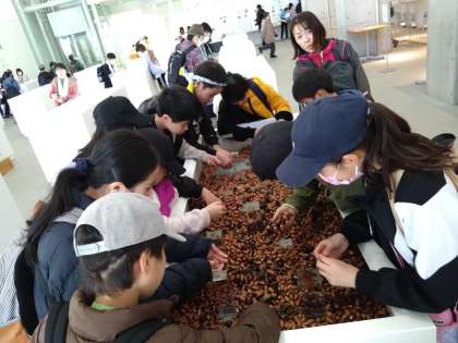 実際に木の実を触れるコーナーは人気でした。どんぐりや松ぼっくりを触っては感触を楽しんでいました。