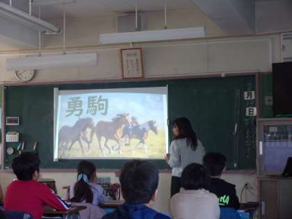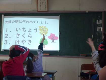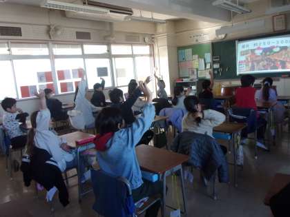 八王子祭りの由来を聞いたり、八王子祭り以外にも、八王子にはたくさんのお祭りがあることを映像資料を使って教えてもらいました。子どもたちから、「そうなんだ!」「知らなかった!!」といった声や、「そのお祭り、行ったことあるよ!!」といった声が聞こえてくるほど集中して聞いていました。