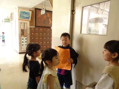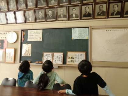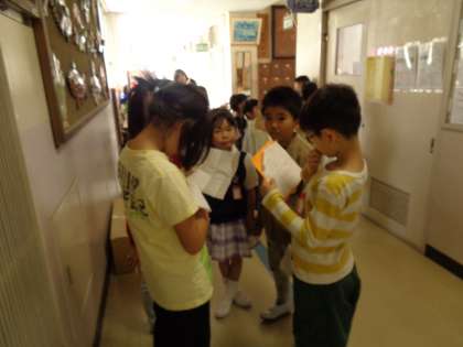 今日も1・2年生の学校探検がありました。2年生にリードしてもらい、1年生が学校のいろいろなところを紹介していました。校長室では、ソファーが珍しかったようで、「座ってもいいですか?」というリクエストもありました。また、「校長先生は、これまでに何人いるの?」という質問があったので、応接室の歴代の校長先生の写真も紹介しました。初めて入るお部屋や写真に興味津々で楽しく探検できたようです。