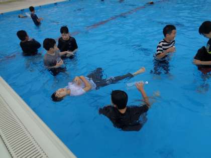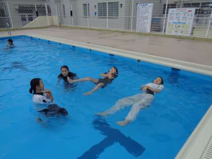 最後は、ペットボトルを使って浮く練習をしました。ペットボトルが浮力になり、体を長い時間浮かせておくことができることを体験できました。これから夏休みを迎えます。海や川に出かけて水遊びをする機会も多くあると思います。連日、川や海での事故が報道されているように、水の怖さを改めて感じさせられることが多くあると思います。服を着た状態での動きにくさを体感することで、落ち着いて命を守る行動ができるようしっかりと学習していきます。