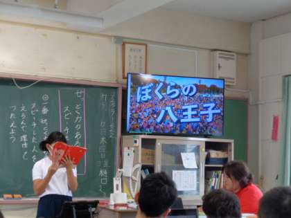 5年生から国語の発表があるので聞きに来てほしいとのお話をいただき、授業を参観しました。国語の学習で、「八王子の町自慢」をテーマに、伝えたい内容をスライドにまとめ発表していました。「高尾山」や「八王子祭り」、「浅川」や「冨士森公園」「道の駅」「夕焼け小焼けの里」などの名所や、「八王子ラーメン」、「都まんじゅう」など食べ物、「ホタル」、「はちおうじ出身の有名人」「ぼくらの八王子(歌)」など、楽しい視点から八王子市のアピールをしていました。スライドの完成度の高さや、クイズなどを取り入れた工夫など、どの発表も見ごたえがあり感心しました。八王子の良さがしっかりと伝わる内容で、地域学習としてもすばらかったです。