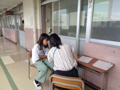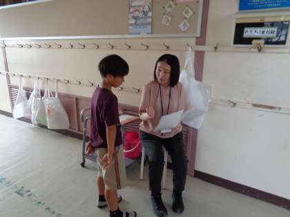 1学期の頑張りが記された通知表を一人ひとり受け取り、先生と一緒に成長を確かめ合う姿もありました。
