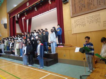 今日は6年生を送る会がありました。早いもので、6年生と一緒に過ごせる日が、残り15日となりました。今日は在校生が6年生に感謝の気持ちを伝えようと張り切って参加していました。「6年生入場」では、3年生がアーチをもってお出迎えしました。主役の6年生が恥ずかしそうにしながらも、ニコニコ笑顔で入場してきました。