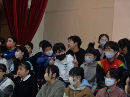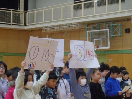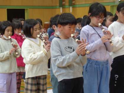 3年生の出し物は、6年生が生まれた年から今までの時代ではやった歌や出来事、流行った食べ物などをクイズで出題しました。懐かしいフレーズが出てくるたびに、「あった!あった!」「懐かし〜」と振り返っていました。また、学校にまつわるクイズも出題され、考え込む姿もありました。改めて6年間の出来事や学校のことなどを思い出していました。最後はリコーダーそうです。成長した3年生の姿も披露してくれました。