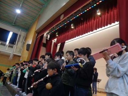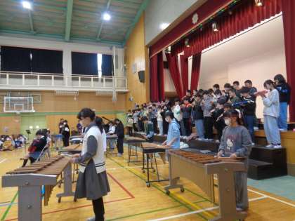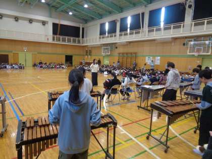 最後は6年生のお礼の演奏です。在校生への温かいメッセージの後、「名探偵コナン」のテーマソングの合奏を披露してくれました。在校生が、その素晴らしい演奏にうっとりと聞きほれる姿がありました。演奏後にはアンコールが起こるほど素晴らしい演奏でした。6年生の演奏に全校児童の心が一つになった時間になりました。やっぱり6年生ってすごいな!と思わせる時間となりました。