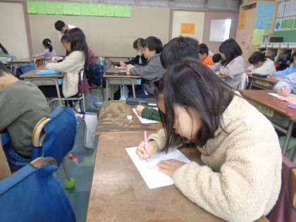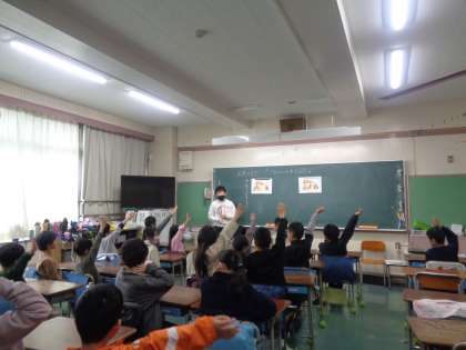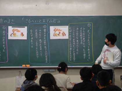 2年生の道徳の授業を参観しました。「さるへいと立てふだ」の教材を使って、「うそをついたり、ごまかしたりしない」ことについて学習しました。柿を独り占めしようとするさるへいの気持ちを想像させながら、うそをついた時の自分のもやもやした気持ちや、正直に言えてすっきりした気持ちを振り返りました。さるへいの気持ちの変化をとらえ、「正直に言えたら、すっきりしたと思う」「人のことを考えられるようになって、友達も増えたからうれしいと思う」という発言が聞かれ、学習にしっかりと向き合って考えている様子がうかがえました。