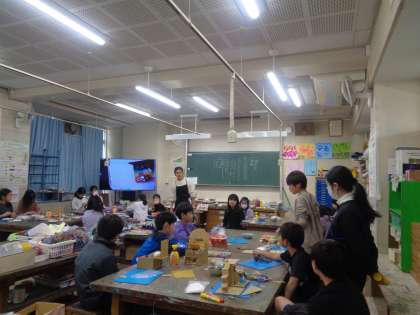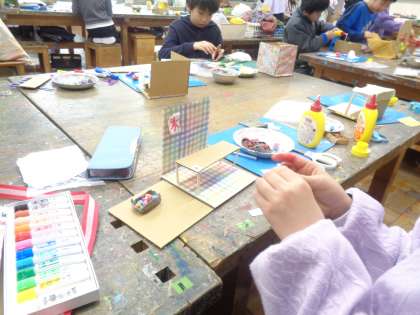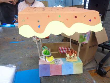 4年生の図工の授業を参観しました。紙粘土を使ってお店屋づくりをしていました。並べる商品を考え、紙粘土に色を付けて作っていきます。どんなお店にするかワクワクしながら考えている様子が伝わってきました。看板を作ったり、メニューを作ったりと、お店の外装も工夫していました。お客さんが立ち寄って食事ができるテーブルやいすなども作っている子もいて、楽しい商店街が出来上がっていました。