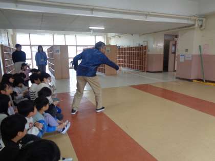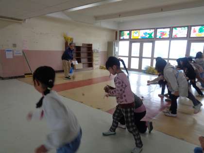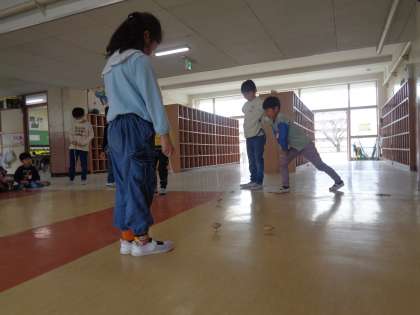 ひもの巻き方と、こま回しの約束を確認した後、いよいよピロティでコマ回しに挑戦です。コツをすぐにつかんで一度で回せた子もいましたが、なかなか回せない子も・・・それでも、こま回しのお約束「何度も練習する。できなくても泣かない」の約束をしっかり守って、何度も何度も練習する姿が見られました。どの子もやる気いっぱいで、一生懸命取り組んでいまし