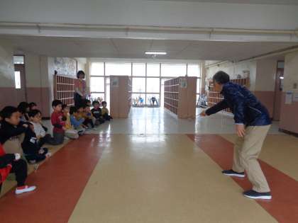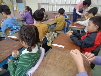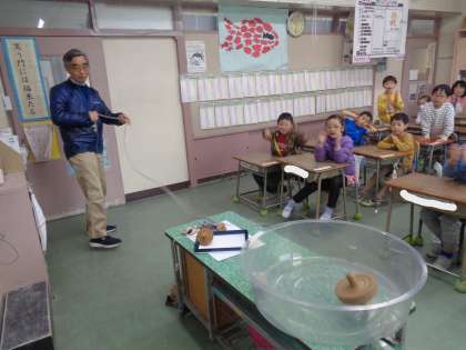 2時間目は2組の子どもたちが駒名人の授業を受けます。栗原先生は大きなコマで糸の巻き方や回し方の見本を見せてくれました。大きいコマが回ったときは、子どもたちから「すごーい!!」と歓声が上がります。教室で巻き方を練習した後は、ピロティで練習します。何度も何度も回す練習をしているうちに、あちこちから「できた!」「回った!」という声が聞こえる様になってきました。約束通り、あきらめずに練習をしたので、上達も早いです。
