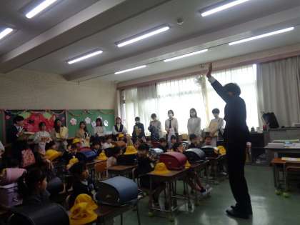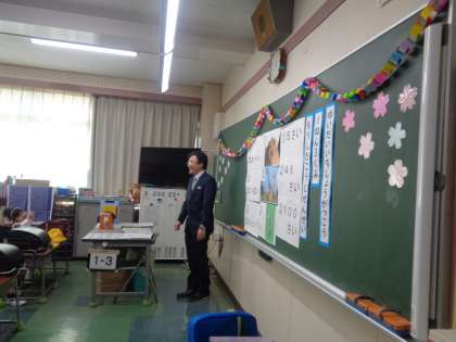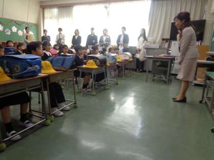 写真撮影の後は、初めての学級指導がありました。先生からお名前を呼ばれ、「はい!」と元気に挨拶する姿がありました。先生のお名前もすぐに覚えたようです。真新しいランドセルに新品の教科書、黄色い帽子、ピカピカの1年生は、お話の聞き方も上手でした。