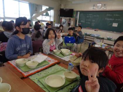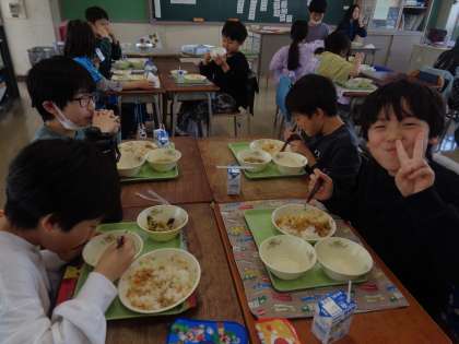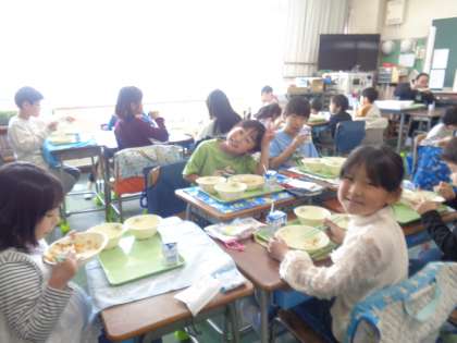 給食の様子を見に教室を回っていくと、ニコニコ笑顔でポーズを決めてくれる子が多かったです。給食の時間は、1日にの中でも一番楽しみな時間です。「勉強しっかり おなかがすいたら おいしい給食で充電」(由井一物語より)給食はゆい一っ子の元気の源です。