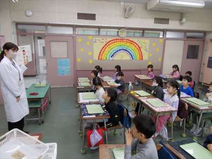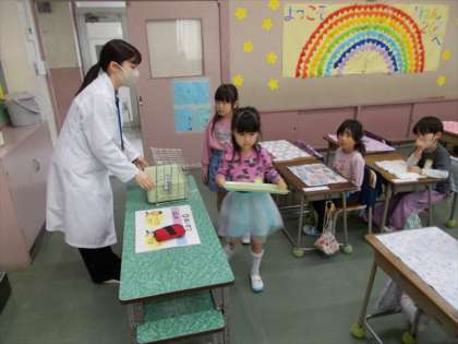 給食を取りに行く順番や並び方など、一つ一つ確認しながら練習しました。お盆をしっかり持って自分の席まで慎重に運びます。食べた後の片付けの仕方も練習しました。みんなとても上手にできました。幼稚園や保育園で教えてもらったことをしっかりと学校生活でも活かしていました。
