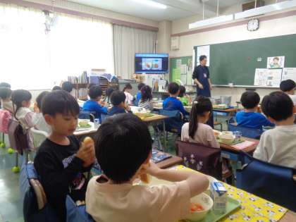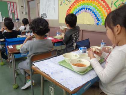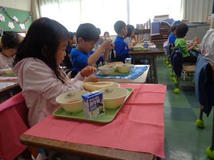 1年生の給食が始まって2日目。昨日よりも早く支度ができて、早めに「いただきます」をすることができました。今日はパンとポークビーンズでした。パンが好きな子が多かったようで、「おいしい!」「今日の給食のメニュー、だいすき」と進んで食べる様子が見られました。