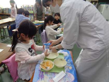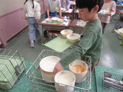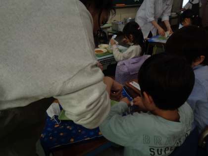 給食の一番の難関は、飲み終わった牛乳パックを開く作業です。あらかじめ写真で分かりやすく教えてもらっていましたが、いざとなると、「できない…」「難しいよ…」とあちこちから聞こえてきました。お手伝いの先生たちに手伝ってもらって練習中です。片づけはとても上手にできました。