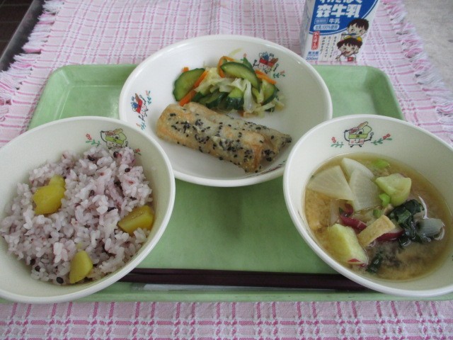 秋月ごはんは、黒米を入れて色付けしたごはんに、甘く煮た栗が入ったごはんです。