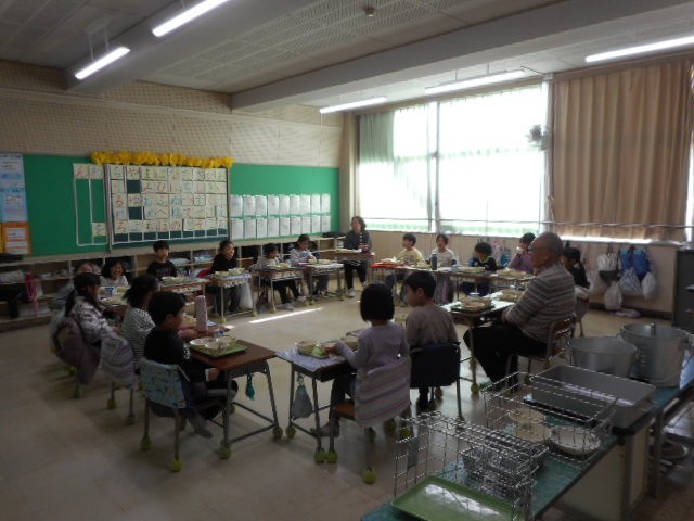 教室で交流しながら給食を一緒に食べました。