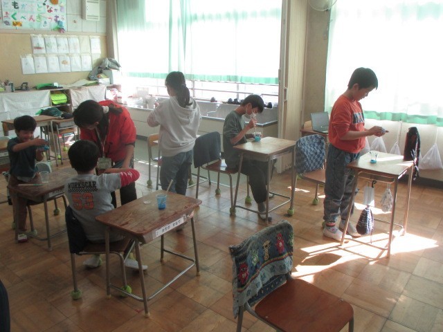 スライムを作りました。指定された量の水や洗濯糊、ほう砂などを自分で測ったり、かき混ぜたりして正しい工程でスライムを作ることができました。スライムに触った感触が面白くて「どろどろしている!」「気持ち悪ーい!」と言いながらも大興奮な子供たちでした。おまけで泡スライムというものを作って見せると「ビールみたいだね~。」と興味津々の様子でした。科学遊びを通じて、理科に興味がもてるようになっていくことでしょう。