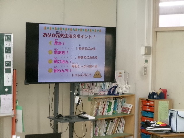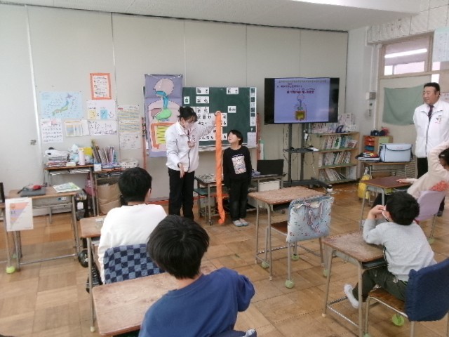ヤクルトの方に来ていただき、お腹のことについて出前授業をしていただきました。お腹の中に6mの小腸が入っていること、大腸は1.5mの長さがあることを模型で知ることができました。思った以上に長いことが分かり、子供たちは驚きの声をあげていました。また、腸内の細菌の重さは全部で1kgであることを体感するとやはり、驚きの声をあげる子供たちでした。初めて知ることが多くて、勉強になりました。