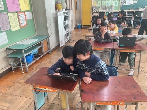 今日の外国語活動では、ペアになり形を伝え合う活動しました。クロームブックを使い、楽しそうに伝え合っていました。