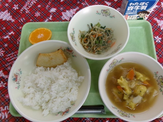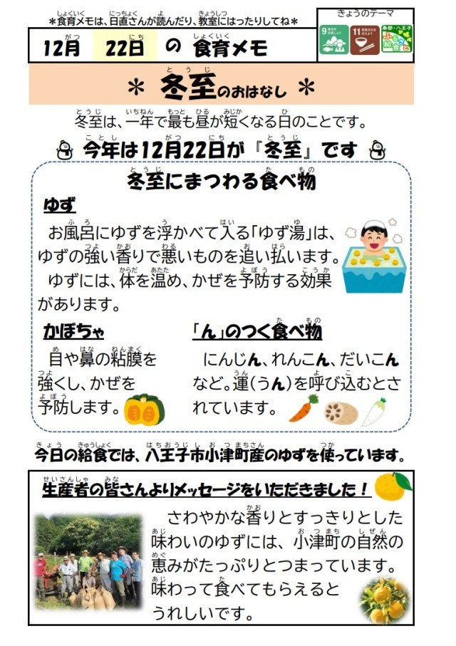 給食では、八王子産のゆずを使った「いかのゆずみそ焼き」をいただきました♪