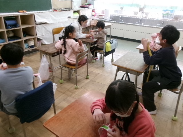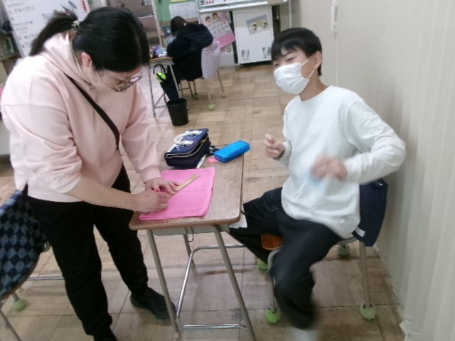 三学期は、マフラーを作っています。編み機を使って毛糸を丁寧に織り込んでいきます。繰り返しの作業ですが、30分以上集中して取り組むことができるようになってきました。完成が見えてくると、首に巻き付けてみて喜びを表す子もいました。高学年の友達は手縫いで雑巾やマスコットを作っています。様々な手作業で巧緻性を高められるようにしています。
