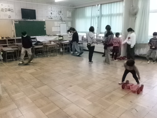 今月は、バランス運動です。バランスペダルとバランスボードという器具を目の当たりにして子供たちは、夢中で取り組んでいます。バランスペダルでは、両足をバランスを崩さないように左右交互に動かしていくと前に進むことができます。「一輪車に乗っているみたい。」というのが子供たちの感想でした。体幹の力を養っていきます。