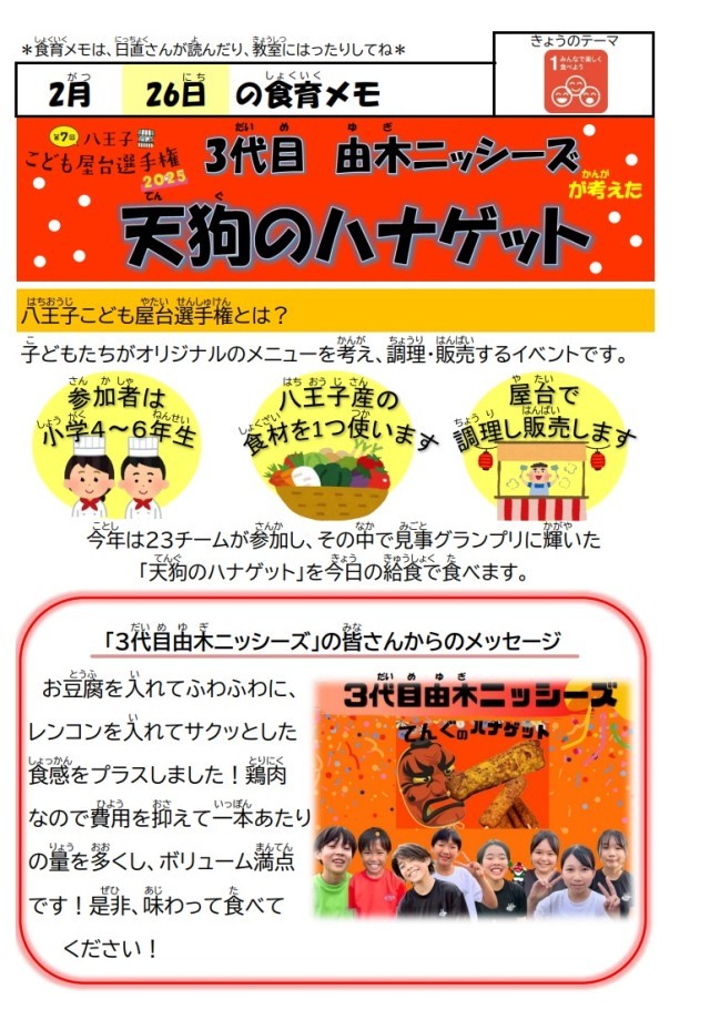 今日は、グランプリを受賞した3代目由木ニッシーズのみなさんが考えた「天狗ハナゲット」