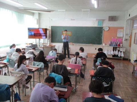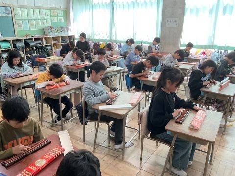 今日は、そろばん教室の先生がそろばんを教えてくれました。たし算やひき算、かけ算をそろばんで計算しました。定位点や一珠など用語を知り、計算に意欲的に取り組みました。