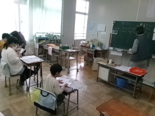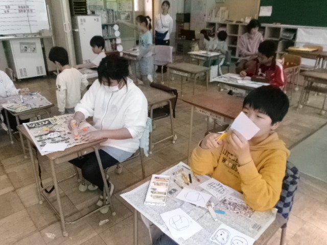 この日の図工は、自分の好きな食べ物やおもちゃなどを描いて一つの作品に仕上げました。好きなものを人に紹介するということは、子供たちにとってわくわくすることのようで、作品を丁寧に作ろうとする態度がよく見られました。作品発表の場面では、友達のことを知る機会にもなり、真剣に見聞きすることができました。