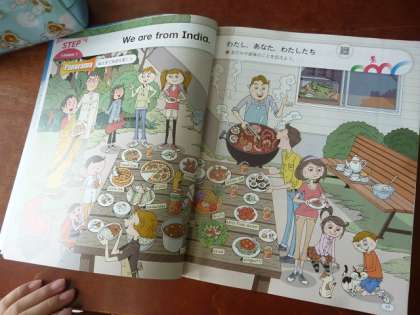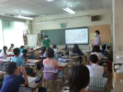 今日は、ALTの先生が来校する日でした。去年と同じマーク先生です。子供たちは英文の説明を聞き、教科書の絵を頼りにしながら場面の様子を想像していました。