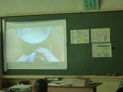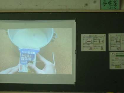 5年生の教室をのぞくと、映像を見ていました。今年度から給食で出る牛乳が紙パックになります。その開き方や飲み残しの処理の仕方などを事前に確認していました。