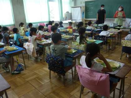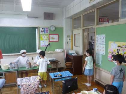配膳を待っているときは、前の人との間隔を空けて並んでいます。給食をもらった人は、おしゃべりしないで静かに待っていました。
