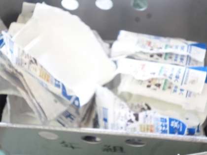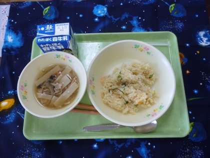 今日の献立は、エビチャーハンとワンタンスープ、牛乳です。牛乳は、今年度から紙パックになり、飲み終わった後は手で開かなくてはなりません。みんな初めてでしたが、上手に開くことができていました。