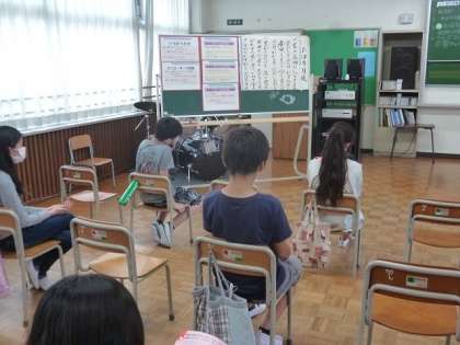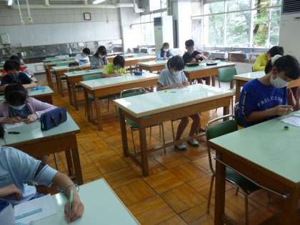 家庭科室では、6年2組の半分の子供たちが、座席の間隔をとって作業していました。あとの半分の子供たちは、音楽室で学習しています。家庭科と音楽の授業は、同じ時間になるように時間割を調整し、クラスを2グループに分けてローテーションしながら進めています。