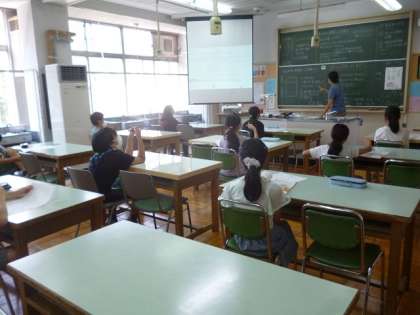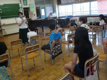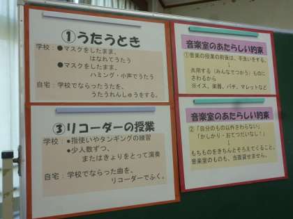 昨日、6年生が各学級2グループに分かれて、同時に音楽と家庭科の授業を行っていることを紹介しましたが、5年生も同じように工夫して授業を行っていました。家庭科では初めて使う部屋の様子を見て回ったり、音楽では、音楽室での新しい約束について確認したりしていました。