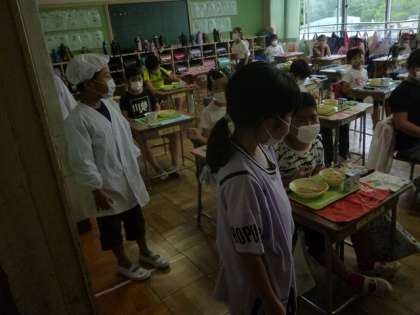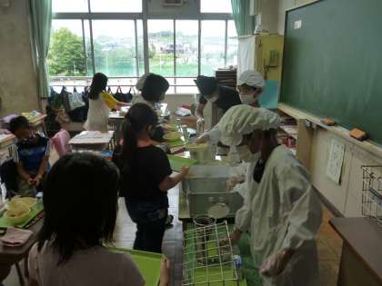 給食の時間に3年生の教室に行ってみました。誰もおしゃべりしないで静かに待っていて立派です。当番さんも最少人数で、しっかり手を洗い、手袋着用で感染防止に努めています。