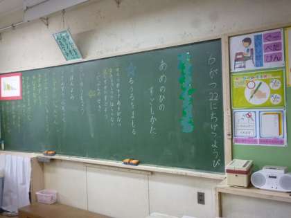 1年生の教室では、雨の日の過ごし方について話し合っていました。自分たちでルールを作れるなんて、1年生すごい! 算数の教科書の後ろにすごろくがあることに誰かが気付き、サイコロがあったらこれでも遊べる!と盛り上がっていました。
