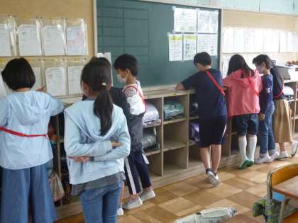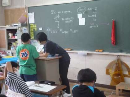 4年生の教室では、赤いたすきをした「丸付け先生」が、友達のノートに丸付けをしてあげていました。早く問題を解き終わった子供たちが、黒板のところにかけてあるたすきを付けて、どんどん先生になっていくようです。
