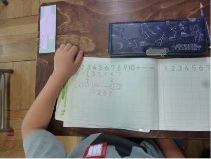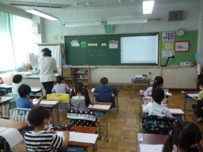 1年生は、「ふえるといくつ」という学習をしていました。たし算の学習です。実物投影機で映された先生のノートをお手本にして、みんな上手にノートがまとめられていました。