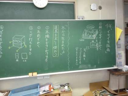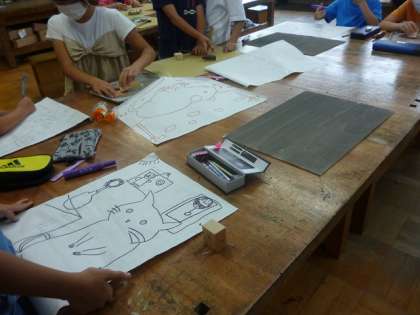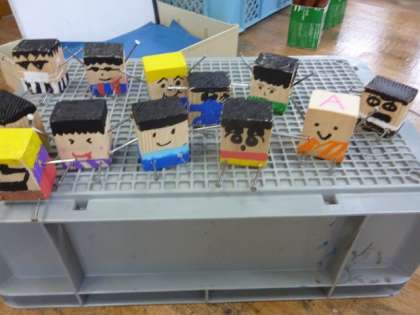 版画のデザイン画が仕上がった人から、道具を正しく使ってマスコットを作っていました。何やら個性的なマスコットが並んでいます。楽しいですね。くぎは上手に打てたかな?