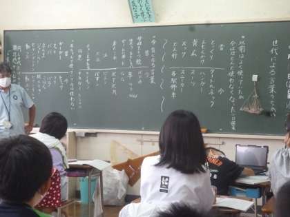 6年生は国語で、「世代による言葉のちがい」について学習していました。「えもんかけ」や「背広」などという言葉は、私たちは分かりますが、子供たちには聞きなれない言葉ですね。逆に、若者が使っている言葉は、私たちには理解できないものがあります。世代はちがっても、お互いに美しい日本語を使いたいものです。